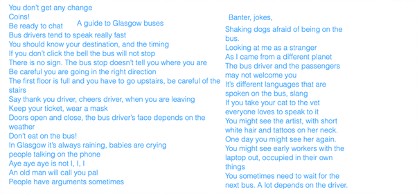 While I was thinking about the poems and what they meant for my research, I was also thinking about ways to share this writing and insight with a wider audience. Thanks to the perseverance of MIN’s Rose Filippi, the idea of publishing the poems in a book became a reality. Working with a creative team including Rose, Anastasia Maria Tariq, illustrator Sara Abdelnasser, and fellow SGSAH researcher (and current blogger) Garry McLaughlin[7], we shaped the collection into a book, published in March 2022.[8] The contributors are listed in the back of the book with their own bios, some under pseudonyms and some not. Their words are celebrated and read by hundreds of people. My PhD research has been enriched by the generosity and creativity of the women who participated in the workshops, but their impact extends beyond that. The poem “A Guide to Glasgow Buses”, framed as advice to newcomers mystified by the unspoken rules of public transport, inspired this commitment in the Glasgow Green Party manifesto for the local elections