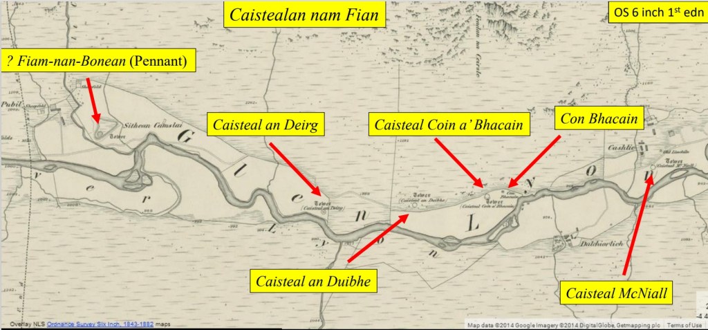 Duncan Campbell (1888) elaborated on the names of some of these individual structures in Glen Lyon, such as Caisteal an Dearg; and Caisteal a’ Chon-bhacain (where the Fianna tethered their dogs).
