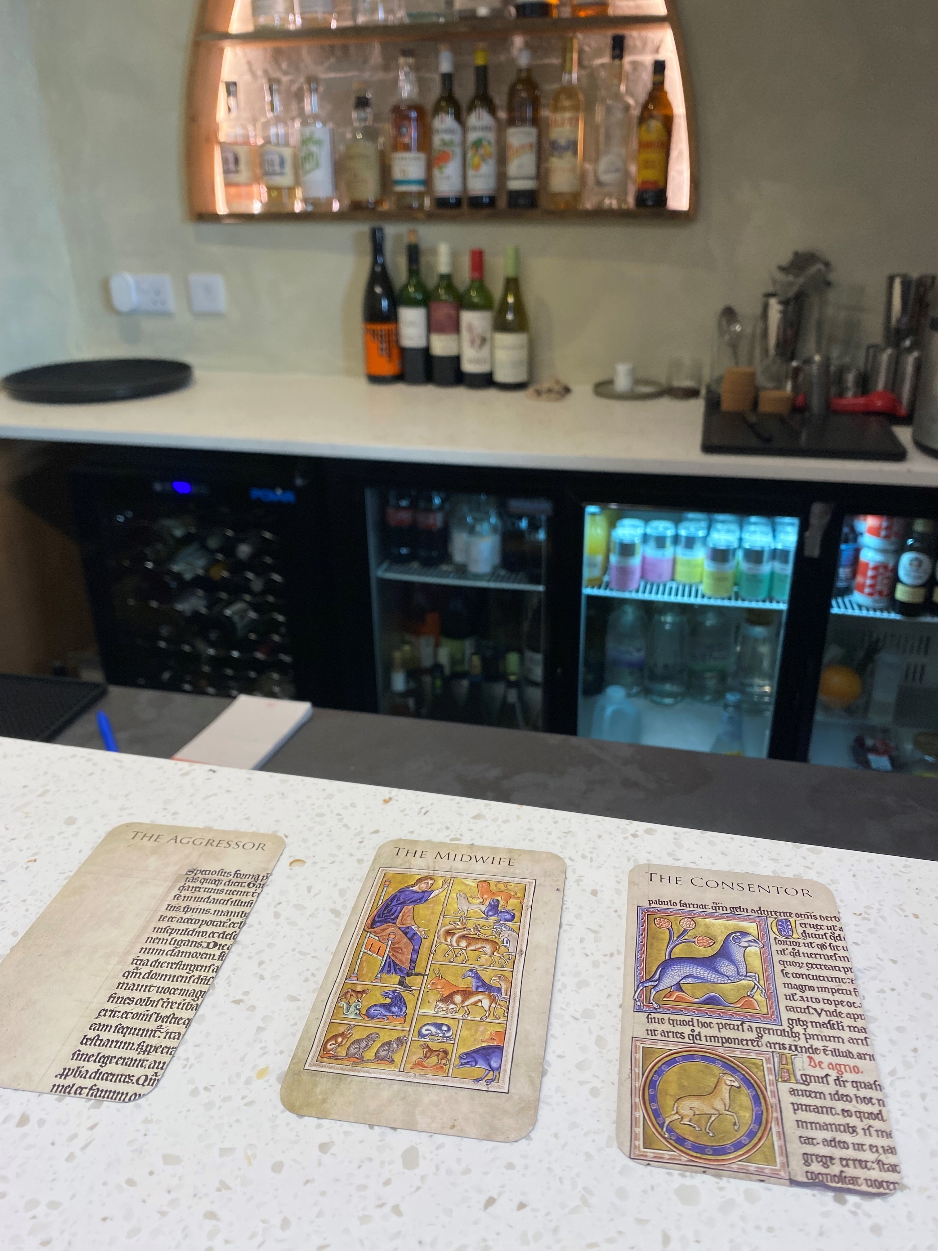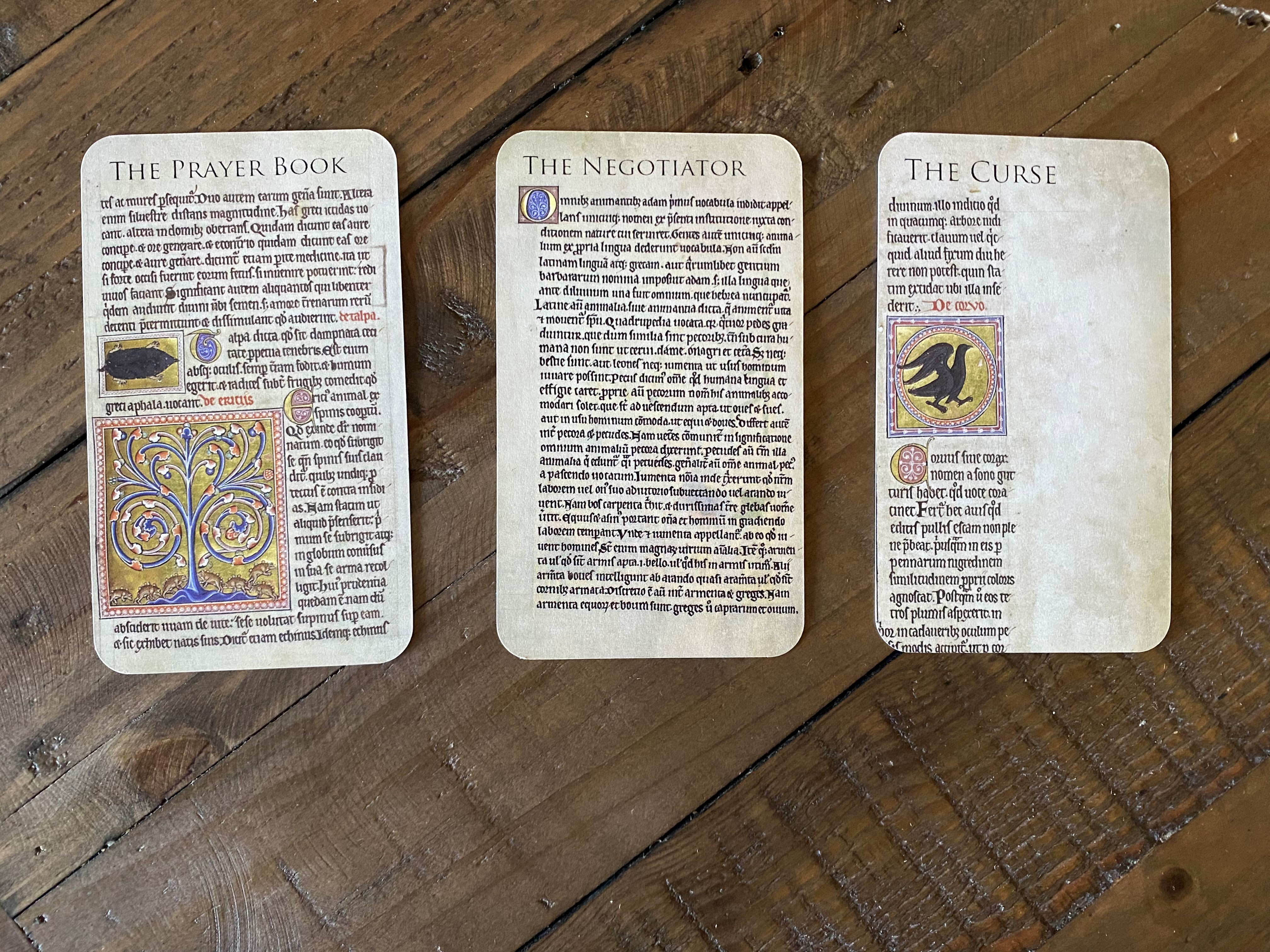 In terms of storytelling, picking three cards from a deck of seventy-eight can make for a range of narratives. Because the reading embarks from the question ‘What kind of medieval woman are you?’, some cards like ‘The Heiress’, ‘The Mother’, or ‘The Hostess’, lend themselves to more tangible stories, while others – like those in the Material Wealth category, including ‘The Spoon’, ‘The Prayer Book’, and ‘The Tapestry’ – can be more challenging to build a narrative around, though not impossible. The challenge of crafting a new story for each person keeps me on my toes, and I improve with each reading.